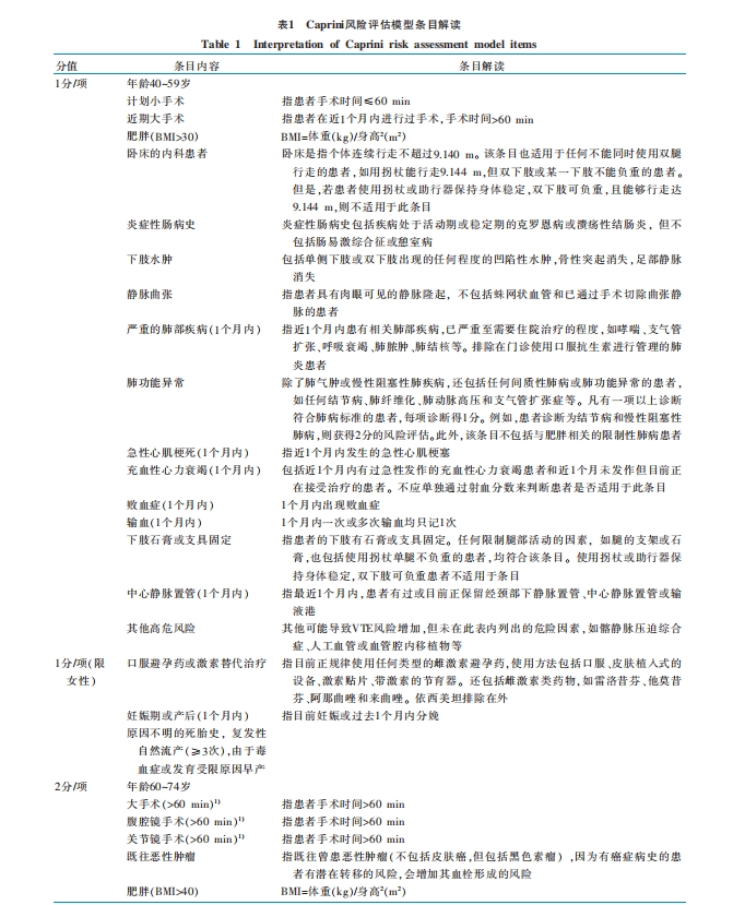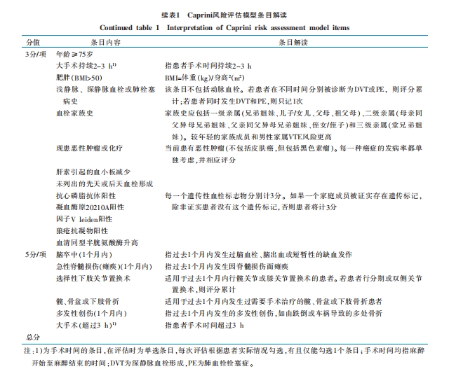 建議對(duì)所有普通外科患者進(jìn)行VTE風(fēng)險(xiǎn)評(píng)估,基于臨床經(jīng)驗(yàn)和大量的循證醫(yī)學(xué)證據(jù),推薦使用Caprini風(fēng)險(xiǎn)評(píng)估模型,對(duì)普通外科患者進(jìn)行VTE風(fēng)險(xiǎn)評(píng)估。Caprini風(fēng)險(xiǎn)評(píng)估模型涵蓋了住院患者常見的各類VTE風(fēng)險(xiǎn)因素,該模型在世界范圍內(nèi)廣泛運(yùn)用并在中國(guó)人群中得到了驗(yàn)證。2016年發(fā)表的《中國(guó)普通外科圍手術(shù)期血栓預(yù)防與管理指南》中,明確推薦使用Caprini風(fēng)險(xiǎn)評(píng)估模型評(píng)估普通外科圍手術(shù)期患者的VTE發(fā)生風(fēng)險(xiǎn)。建議護(hù)理人員通過查閱病歷問診、查體,實(shí)驗(yàn)室檢查等方法,獲取全面且準(zhǔn)確的患者疾病信息,并在正確理解Caprimi風(fēng)險(xiǎn)評(píng)估模型各條目含義(表1)的基礎(chǔ)上,對(duì)患者進(jìn)行VTE風(fēng)險(xiǎn)評(píng)估,以提高風(fēng)險(xiǎn)評(píng)估結(jié)果的準(zhǔn)確性和有效性。此外國(guó)際標(biāo)準(zhǔn)化比值,D-二聚體等凝血指標(biāo)可以動(dòng)態(tài)體現(xiàn)患者的凝血功能情況,當(dāng)患者病情平穩(wěn),而D-二聚體進(jìn)行性升高時(shí),應(yīng)當(dāng)警惕VTE的發(fā)生。建議護(hù)理人員在對(duì)普通外科患者進(jìn)行VTE風(fēng)險(xiǎn)評(píng)估時(shí),持續(xù)關(guān)注患者的國(guó)際標(biāo)準(zhǔn)化比值,D-二聚體等實(shí)驗(yàn)室指標(biāo)變化,以達(dá)到VTE預(yù)警監(jiān)測(cè)的目的。