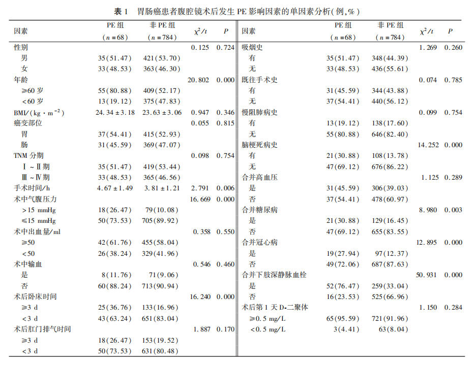 胃腸癌是臨床常見的消化系統(tǒng)惡性腫瘤,致死率極高,據(jù)統(tǒng)計(jì),胃癌和結(jié)直腸癌的致死率在全部惡性腫瘤中分別排第三位和第四位。 近年來,隨著生活水平的不斷提升、飲食與生活方式不斷變化,胃腸癌的發(fā)生率呈現(xiàn)出不斷上升的趨勢,而以手術(shù)治療為核心的綜合治療也逐漸成為胃腸癌的主要治療手段 。 目前,腹腔鏡手術(shù)因其創(chuàng)傷小、出血少、恢復(fù)快等優(yōu)勢已被廣泛應(yīng)用于胃腸癌患者的臨床治療中,但由于其氣腹過程會(huì)引起腹內(nèi)壓、靜脈壓等異常,進(jìn)而會(huì)導(dǎo)致血瘀、血栓的發(fā)生,故常易引發(fā)患者發(fā)生術(shù)后肺栓塞 (PE)。PE是常見的肺功能障礙疾病,患者的1個(gè)月致死率高達(dá) 4.9%~6.6% ,一旦發(fā)生會(huì)顯著增加患者預(yù)后不良的發(fā)生風(fēng)險(xiǎn)。 萬霖等表示,惡性腫瘤患者進(jìn)行手術(shù)治療后發(fā)生致死性 PE 的幾率高達(dá) 6% ,其中腹腔鏡手術(shù)治療后的 PE發(fā)生率更高。 故,為降低胃腸癌患者腹腔鏡術(shù)后發(fā)生PE的風(fēng)險(xiǎn),及早做好預(yù)防與治療措施,本研究特選取852例行腹腔鏡手術(shù)治療的胃腸癌患者為研究對象, 分析導(dǎo)致其發(fā)生術(shù)后 PE的危險(xiǎn)因素,以期為胃腸癌患者腹腔鏡術(shù)后PE的預(yù)防與早期干預(yù)提供參考。