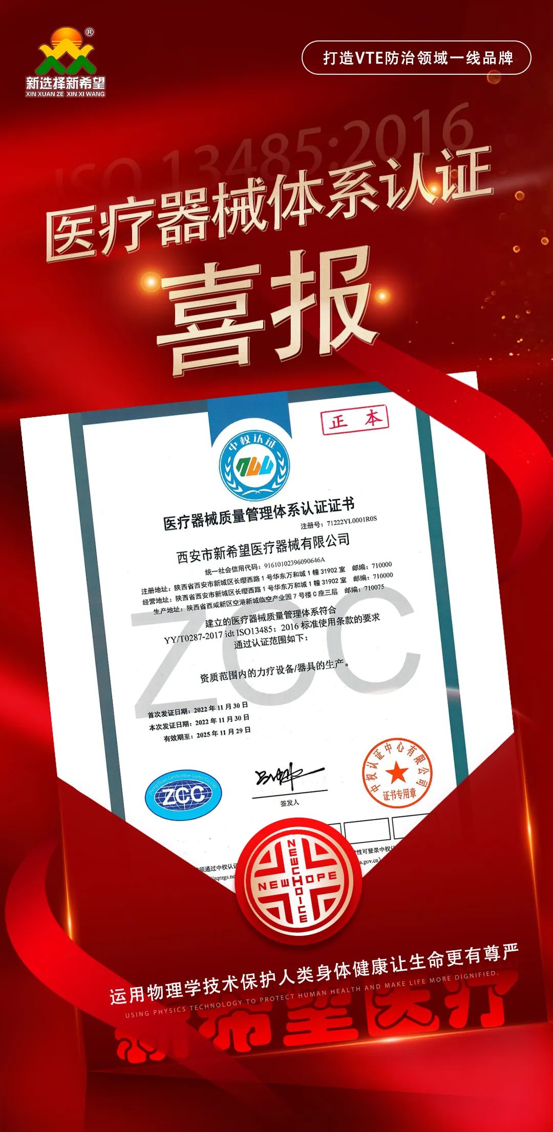 近日,西安市新希望醫(yī)療器械有限公司(簡(jiǎn)稱“新希望醫(yī)療”)在經(jīng)評(píng)審專家嚴(yán)格審核后,正式獲得ISO13485:2016醫(yī)療器械質(zhì)量管理體系認(rèn)證并獲得證書。